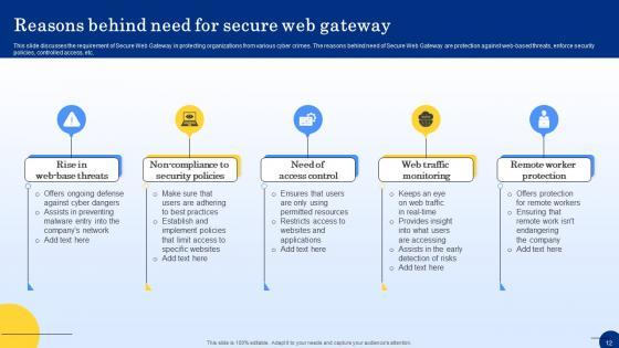 This slide discusses the requirement of Secure Web Gateway in protecting organizations from various cyber crimes. The reasons behind need of Secure Web Gateway are protection against web-based threats, enforce security policies, controlled access, etc. Slidegeeks has constructed Reasons Behind Need For Secure Web Gateway Web Threat Protection System after conducting extensive research and examination. These presentation templates are constantly being generated and modified based on user preferences and critiques from editors. Here, you will find the most attractive templates for a range of purposes while taking into account ratings and remarks from users regarding the content. This is an excellent jumping-off point to explore our content and will give new users an insight into our top-notch PowerPoint Templates. This slide discusses the requirement of Secure Web Gateway in protecting organizations from various cyber crimes. The reasons behind need of Secure Web Gateway are protection against web-based threats, enforce security policies, controlled access, etc.