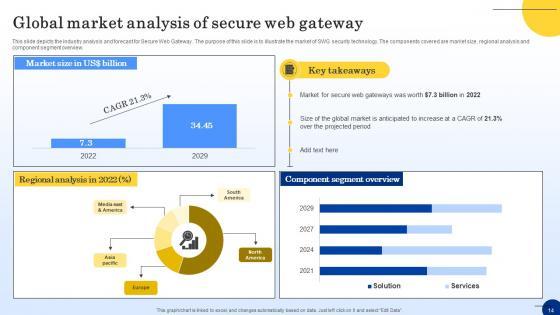 This slide depicts the industry analysis and forecast for Secure Web Gateway. The purpose of this slide is to illustrate the market of SWG security technology. The components covered are market size, regional analysis and component segment overview. If you are looking for a format to display your unique thoughts, then the professionally designed Global Market Analysis Of Secure Web Gateway Web Threat Protection System is the one for you. You can use it as a Google Slides template or a PowerPoint template. Incorporate impressive visuals, symbols, images, and other charts. Modify or reorganize the text boxes as you desire. Experiment with shade schemes and font pairings. Alter, share or cooperate with other people on your work. Download Global Market Analysis Of Secure Web Gateway Web Threat Protection System and find out how to give a successful presentation. Present a perfect display to your team and make your presentation unforgettable. This slide depicts the industry analysis and forecast for Secure Web Gateway. The purpose of this slide is to illustrate the market of SWG security technology. The components covered are market size, regional analysis and component segment overview.