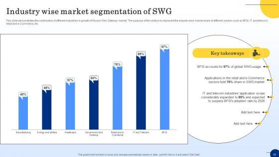 This slide demonstrates the contribution of different industries in growth of Secure Web Gateway market. The purpose of this slide is to represent the industry wise market share of different sectors such as BFSI, IT and telecom, retail and e-Commerce, etc. Formulating a presentation can take up a lot of effort and time, so the content and message should always be the primary focus. The visuals of the PowerPoint can enhance the presenters message, so our Industry Wise Market Segmentation Of SWG Web Threat Protection System was created to help save time. Instead of worrying about the design, the presenter can concentrate on the message while our designers work on creating the ideal templates for whatever situation is needed. Slidegeeks has experts for everything from amazing designs to valuable content, we have put everything into Industry Wise Market Segmentation Of SWG Web Threat Protection System This slide demonstrates the contribution of different industries in growth of Secure Web Gateway market. The purpose of this slide is to represent the industry wise market share of different sectors such as BFSI, IT and telecom, retail and e-Commerce, etc.