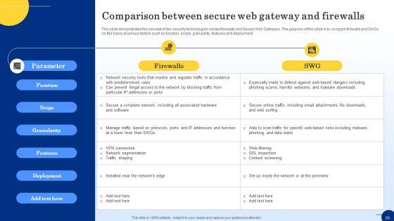 This slide demonstrates the concept of two security technologies named firewalls and Secure Web Gateways. The purpose of this slide is to compare firewalls and SWGs on the basis of various factors such as function, scope, granularity, features and deployment. Present like a pro with Comparison Between Secure Web Gateway And Firewalls Web Threat Protection System. Create beautiful presentations together with your team, using our easy-to-use presentation slides. Share your ideas in real-time and make changes on the fly by downloading our templates. So whether you are in the office, on the go, or in a remote location, you can stay in sync with your team and present your ideas with confidence. With Slidegeeks presentation got a whole lot easier. Grab these presentations today. This slide demonstrates the concept of two security technologies named firewalls and Secure Web Gateways. The purpose of this slide is to compare firewalls and SWGs on the basis of various factors such as function, scope, granularity, features and deployment.