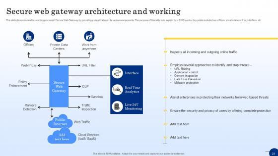 This slide demonstrates the working process of Secure Web Gateway by providing a visualization of its various components. The purpose of this slide is to explain how SWG works. Key points included are offices, private data centres, interface, etc. This Secure Web Gateway Architecture And Working Web Threat Protection System from Slidegeeks makes it easy to present information on your topic with precision. It provides customization options, so you can make changes to the colors, design, graphics, or any other component to create a unique layout. It is also available for immediate download, so you can begin using it right away. Slidegeeks has done good research to ensure that you have everything you need to make your presentation stand out. Make a name out there for a brilliant performance. This slide demonstrates the working process of Secure Web Gateway by providing a visualization of its various components. The purpose of this slide is to explain how SWG works. Key points included are offices, private data centres, interface, etc.