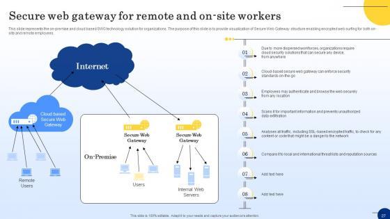 This slide represents the on-premise and cloud based SWG technology solution for organizations. The purpose of this slide is to provide visualization of Secure Web Gateway structure enabling encrypted web surfing for both on-site and remote employees. Do you know about Slidesgeeks Secure Web Gateway For Remote And On Site Workers Web Threat Protection System These are perfect for delivering any kind od presentation. Using it, create PowerPoint presentations that communicate your ideas and engage audiences. Save time and effort by using our pre-designed presentation templates that are perfect for a wide range of topic. Our vast selection of designs covers a range of styles, from creative to business, and are all highly customizable and easy to edit. Download as a PowerPoint template or use them as Google Slides themes. This slide represents the on-premise and cloud based SWG technology solution for organizations. The purpose of this slide is to provide visualization of Secure Web Gateway structure enabling encrypted web surfing for both on-site and remote employees.
