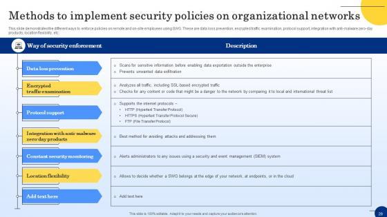 This slide demonstrates the different ways to enforce policies on remote and on-site employees using SWG. These are data loss prevention, encrypted traffic examination, protocol support, integration with anti-malware zero-day products, location flexibility, etc. Are you searching for a Methods To Implement Security Policies On Web Threat Protection System that is uncluttered, straightforward, and original Its easy to edit, and you can change the colors to suit your personal or business branding. For a presentation that expresses how much effort you have put in, this template is ideal With all of its features, including tables, diagrams, statistics, and lists, its perfect for a business plan presentation. Make your ideas more appealing with these professional slides. Download Methods To Implement Security Policies On Web Threat Protection System from Slidegeeks today. This slide demonstrates the different ways to enforce policies on remote and on-site employees using SWG. These are data loss prevention, encrypted traffic examination, protocol support, integration with anti-malware zero-day products, location flexibility, etc.