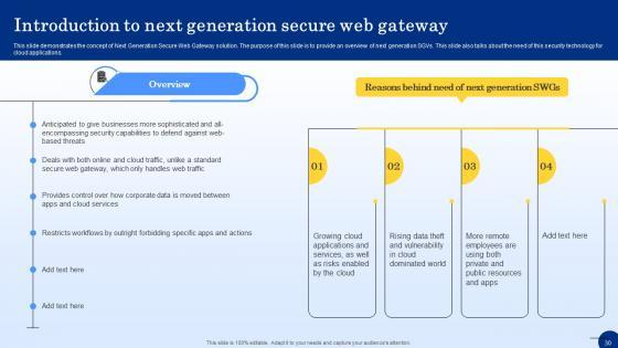 This slide demonstrates the concept of Next Generation Secure Web Gateway solution. The purpose of this slide is to provide an overview of next generation SGVs. This slide also talks about the need of this security technology for cloud applications. This modern and well-arranged Introduction To Next Generation Secure Web Gateway Web Threat Protection System provides lots of creative possibilities. It is very simple to customize and edit with the Powerpoint Software. Just drag and drop your pictures into the shapes. All facets of this template can be edited with Powerpoint, no extra software is necessary. Add your own material, put your images in the places assigned for them, adjust the colors, and then you can show your slides to the world, with an animated slide included. This slide demonstrates the concept of Next Generation Secure Web Gateway solution. The purpose of this slide is to provide an overview of next generation SGVs. This slide also talks about the need of this security technology for cloud applications.