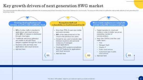 This slide illustrates the different factors which contribute to the increasing need of Next Generation Secure Web Gateways for cloud security. The purpose of this slide is to outline the main growth catalysts of next generation SGV technology market. Explore a selection of the finest Key Growth Drivers Of Next Generation SWG Market Web Threat Protection System here. With a plethora of professionally designed and pre-made slide templates, you can quickly and easily find the right one for your upcoming presentation. You can use our Key Growth Drivers Of Next Generation SWG Market Web Threat Protection System to effectively convey your message to a wider audience. Slidegeeks has done a lot of research before preparing these presentation templates. The content can be personalized and the slides are highly editable. Grab templates today from Slidegeeks. This slide illustrates the different factors which contribute to the increasing need of Next Generation Secure Web Gateways for cloud security. The purpose of this slide is to outline the main growth catalysts of next generation SGV technology market.