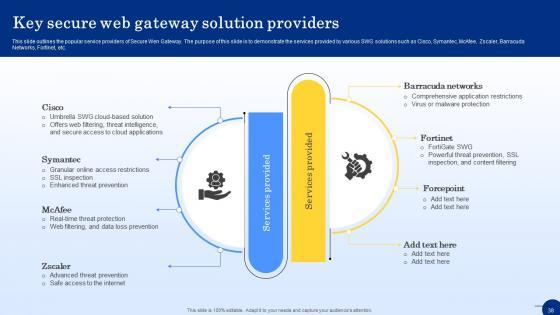 This slide outlines the popular service providers of Secure Wen Gateway. The purpose of this slide is to demonstrate the services provided by various SWG solutions such as Cisco, Symantec, McAfee, Zscaler, Barracuda Networks, Fortinet, etc. The best PPT templates are a great way to save time, energy, and resources. Slidegeeks have 100 percent editable powerpoint slides making them incredibly versatile. With these quality presentation templates, you can create a captivating and memorable presentation by combining visually appealing slides and effectively communicating your message. Download Key Secure Web Gateway Solution Providers Web Threat Protection System from Slidegeeks and deliver a wonderful presentation. This slide outlines the popular service providers of Secure Wen Gateway. The purpose of this slide is to demonstrate the services provided by various SWG solutions such as Cisco, Symantec, McAfee, Zscaler, Barracuda Networks, Fortinet, etc.