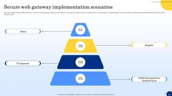 This slide represents the different types of Secure Web Gateway deployment methods. The purpose of this slide is to outline SWG implementation methodologies. These are inline, explicit, transparent and SPAN Switched Port Analyzer port. isolations, etc. This slide represents the different types of Secure Web Gateway deployment methods. The purpose of this slide is to outline SWG implementation methodologies. These are inline, explicit, transparent and SPAN Switched Port Analyzer port. Slidegeeks is one of the best resources for PowerPoint templates. You can download easily and regulate Secure Web Gateway Implementation Scenarios Web Threat Protection System for your personal presentations from our wonderful collection. A few clicks is all it takes to discover and get the most relevant and appropriate templates. Use our Templates to add a unique zing and appeal to your presentation and meetings. All the slides are easy to edit and you can use them even for advertisement purposes. This slide represents the different types of Secure Web Gateway deployment methods. The purpose of this slide is to outline SWG implementation methodologies. These are inline, explicit, transparent and SPAN Switched Port Analyzer port. isolations, etc.