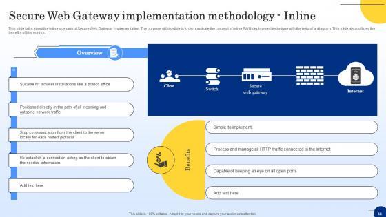 This slide talks about the inline scenario of Secure Web Gateway implementation. The purpose of this slide is to demonstrate the concept of inline SWG deployment technique with the help of a diagram. This slide also outlines the benefits of this method. Find a pre-designed and impeccable Secure Web Gateway Implementation Methodology Explicit Web Threat Protection System. The templates can ace your presentation without additional effort. You can download these easy-to-edit presentation templates to make your presentation stand out from others. So, what are you waiting for Download the template from Slidegeeks today and give a unique touch to your presentation. This slide talks about the inline scenario of Secure Web Gateway implementation. The purpose of this slide is to demonstrate the concept of inline SWG deployment technique with the help of a diagram. This slide also outlines the benefits of this method.