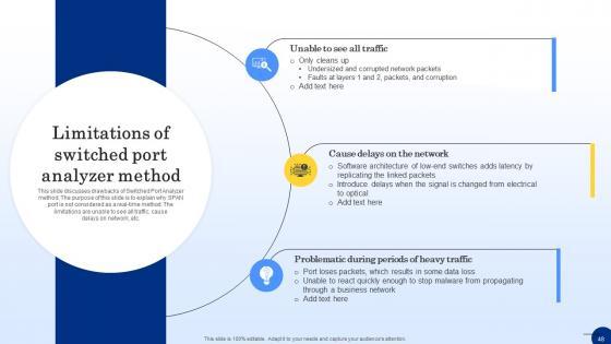 This slide discusses drawbacks of Switched Port Analyzer method. The purpose of this slide is to explain why SPAN port is not considered as a real-time method. The limitations are unable to see all traffic, cause delays on network, etc. The Limitations Of Switched Port Analyzer Method Web Threat Protection System is a compilation of the most recent design trends as a series of slides. It is suitable for any subject or industry presentation, containing attractive visuals and photo spots for businesses to clearly express their messages. This template contains a variety of slides for the user to input data, such as structures to contrast two elements, bullet points, and slides for written information. Slidegeeks is prepared to create an impression. This slide discusses drawbacks of Switched Port Analyzer method. The purpose of this slide is to explain why SPAN port is not considered as a real-time method. The limitations are unable to see all traffic, cause delays on network, etc.