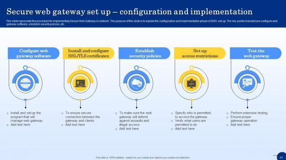This slide represents the procedure for implementing Secure Web Gateway in network. The purpose of this slide is to explain the configuration and implementation phase of SWG set-up. The key points included are configure web gateway software, establish security policies, etc. There are so many reasons you need a Secure Web Gateway Set Up Configuration And Implementation Web Threat Protection System. The first reason is you can not spend time making everything from scratch, Thus, Slidegeeks has made presentation templates for you too. You can easily download these templates from our website easily. This slide represents the procedure for implementing Secure Web Gateway in network. The purpose of this slide is to explain the configuration and implementation phase of SWG set-up. The key points included are configure web gateway software, establish security policies, etc.