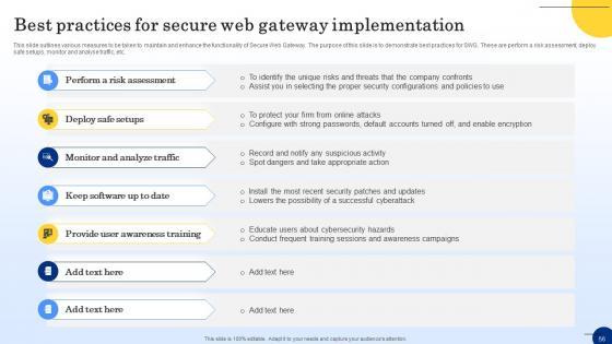 This slide outlines various measures to be taken to maintain and enhance the functionality of Secure Web Gateway. The purpose of this slide is to demonstrate best practices for SWG. These are perform a risk assessment, deploy safe setups, monitor and analyse traffic, etc. There are so many reasons you need a Best Practices For Secure Web Gateway Implementation Web Threat Protection System. The first reason is you can not spend time making everything from scratch, Thus, Slidegeeks has made presentation templates for you too. You can easily download these templates from our website easily. This slide outlines various measures to be taken to maintain and enhance the functionality of Secure Web Gateway. The purpose of this slide is to demonstrate best practices for SWG. These are perform a risk assessment, deploy safe setups, monitor and analyse traffic, etc.