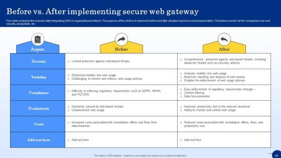 This slide compares the scenario after integrating SWG in organizational network. The purpose of this slide is to represent before and after situation based on several parameters. The factors used to do the comparison are cost, security, productivity, etc. Want to ace your presentation in front of a live audience Our Before Vs After Implementing Secure Web Gateway Web Threat Protection System can help you do that by engaging all the users towards you. Slidegeeks experts have put their efforts and expertise into creating these impeccable powerpoint presentations so that you can communicate your ideas clearly. Moreover, all the templates are customizable, and easy-to-edit and downloadable. Use these for both personal and commercial use. This slide compares the scenario after integrating SWG in organizational network. The purpose of this slide is to represent before and after situation based on several parameters. The factors used to do the comparison are cost, security, productivity, etc.