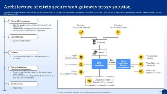 This slide represents the Secure Web Gateway solution provided by Citrix. The purpose of this slide is to demonstrate the architecture of Citrixs SWG solution. The key components included are users, firewall, internet, logstream, SWG appliance, etc. Slidegeeks is one of the best resources for PowerPoint templates. You can download easily and regulate Architecture Of Citrix Secure Web Gateway Proxy Solution Web Threat Protection System for your personal presentations from our wonderful collection. A few clicks is all it takes to discover and get the most relevant and appropriate templates. Use our Templates to add a unique zing and appeal to your presentation and meetings. All the slides are easy to edit and you can use them even for advertisement purposes. This slide represents the Secure Web Gateway solution provided by Citrix. The purpose of this slide is to demonstrate the architecture of Citrixs SWG solution. The key components included are users, firewall, internet, logstream, SWG appliance, etc.
