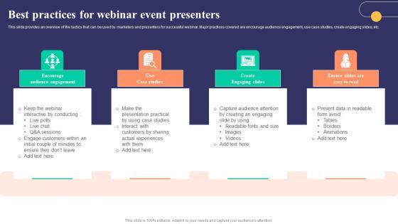 This slide provides an overview of the tactics that can be used by marketers and presenters for successful webinar. Major practices covered are encourage audience engagement, use case studies, create engaging slides, etc. Here you can discover an assortment of the finest PowerPoint and Google Slides templates. With these templates, you can create presentations for a variety of purposes while simultaneously providing your audience with an eye-catching visual experience. Download Best Practices For Webinar Event Presenters Infographics PDF to deliver an impeccable presentation. These templates will make your job of preparing presentations much quicker, yet still, maintain a high level of quality. Slidegeeks has experienced researchers who prepare these templates and write high-quality content for you. Later on, you can personalize the content by editing the Best Practices For Webinar Event Presenters Infographics PDF.
