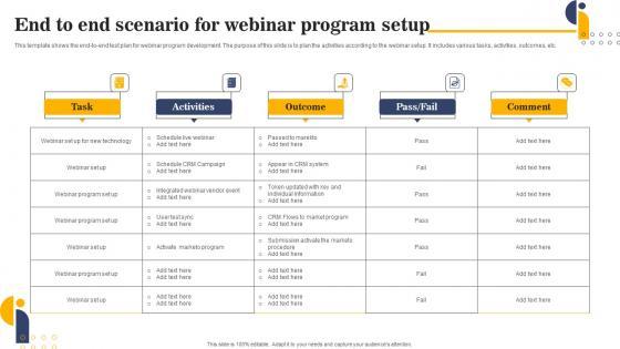 This template shows the end-to-end test plan for webinar program development. The purpose of this slide is to plan the activities according to the webinar setup. It includes various tasks, activities, outcomes, etc.Pitch your topic with ease and precision using this End To End Scenario For Webinar Program Setup Rules Pdf This layout presents information on Individual Information, Submission Activate, Passed Marek It is also available for immediate download and adjustment. So, changes can be made in the color, design, graphics or any other component to create a unique layout. This template shows the end to end test plan for webinar program development. The purpose of this slide is to plan the activities according to the webinar setup. It includes various tasks, activities, outcomes, etc.