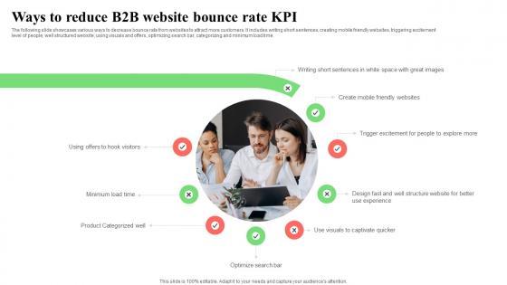The following slide showcases various ways to decrease bounce rate from websites to attract more customers. It includes writing short sentences, creating mobile friendly websites, triggering excitement level of people, well structured website, using visuals and offers, optimizing search bar, categorizing and minimum load time. Pitch your topic with ease and precision using this Ways To Reduce B2B Website Bounce Rate KPI Information Pdf. This layout presents information on Well Structured Website, Using Visuals Offers, Optimizing Search. It is also available for immediate download and adjustment. So, changes can be made in the color, design, graphics or any other component to create a unique layout. The following slide showcases various ways to decrease bounce rate from websites to attract more customers. It includes writing short sentences, creating mobile friendly websites, triggering excitement level of people, well structured website, using visuals and offers, optimizing search bar, categorizing and minimum load time.