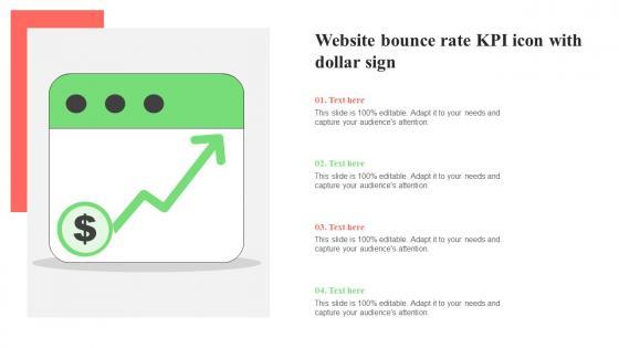 Showcasing this set of slides titled Website Bounce Rate KPI Icon With Dollar Sign Elements Pdf. The topics addressed in these templates are Website Bounce Rate, KPI Icon, Dollar Sign. All the content presented in this PPT design is completely editable. Download it and make adjustments in color, background, font etc. as per your unique business setting. Our Website Bounce Rate KPI Icon With Dollar Sign Elements Pdf are topically designed to provide an attractive backdrop to any subject. Use them to look like a presentation pro.