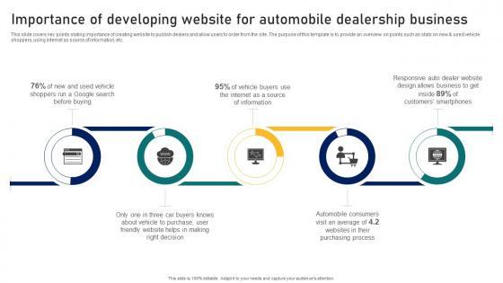 This slide covers key points stating importance of creating website to publish dealers and allow users to order from the site. The purpose of this template is to provide an overview on points such as stats on new and used vehicle shoppers, using internet as source of information, etc. Are you in need of a template that can accommodate all of your creative concepts This one is crafted professionally and can be altered to fit any style. Use it with Google Slides or PowerPoint. Include striking photographs, symbols, depictions, and other visuals. Fill, move around, or remove text boxes as desired. Test out color palettes and font mixtures. Edit and save your work, or work with colleagues. Download Guide To Building A Successful Importance Of Developing Website For Automobile Strategy SS V and observe how to make your presentation outstanding. Give an impeccable presentation to your group and make your presentation unforgettable. This slide covers key points stating importance of creating website to publish dealers and allow users to order from the site. The purpose of this template is to provide an overview on points such as stats on new and used vehicle shoppers, using internet as source of information, etc.