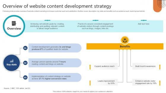 Following slide provides overview of website content marketing to increase customer reach and satisfaction. It further covers description, key stats and benefits such as audience reach, lead improvement etc. Boost your pitch with our creative Overview Of Website Content Development Strategy Step By Step Guide Formats PDF. Deliver an awe-inspiring pitch that will mesmerize everyone. Using these presentation templates you will surely catch everyones attention. You can browse the ppts collection on our website. We have researchers who are experts at creating the right content for the templates. So you do not have to invest time in any additional work. Just grab the template now and use them. Following slide provides overview of website content marketing to increase customer reach and satisfaction. It further covers description, key stats and benefits such as audience reach, lead improvement etc.