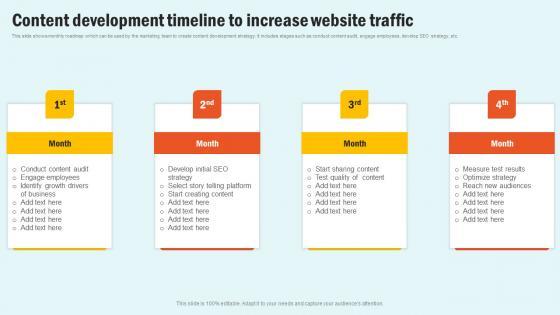 This slide shows monthly roadmap which can be used by the marketing team to create content development strategy. It includes stages such as conduct content audit, engage employees, develop SEO strategy, etc. Do you have an important presentation coming up Are you looking for something that will make your presentation stand out from the rest Look no further than Content Development Timeline To Increase Website Traffic Seo Content Plan To Drive Strategy SS V With our professional designs, you can trust that your presentation will pop and make delivering it a smooth process. And with Slidegeeks, you can trust that your presentation will be unique and memorable. So why wait Grab Content Development Timeline To Increase Website Traffic Seo Content Plan To Drive Strategy SS V today and make your presentation stand out from the rest This slide shows monthly roadmap which can be used by the marketing team to create content development strategy. It includes stages such as conduct content audit, engage employees, develop SEO strategy, etc.