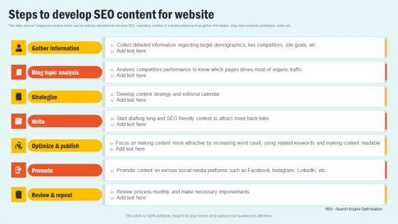 This slide shows 7 stages procedure which can be used by marketers to develop SEO marketing content. It includes steps such as gather information, blog topic analysis, strategize, write, etc. Do you have to make sure that everyone on your team knows about any specific topic I yes, then you should give Steps To Develop Seo Content For Website Seo Content Plan To Drive Strategy SS V a try. Our experts have put a lot of knowledge and effort into creating this impeccable Steps To Develop Seo Content For Website Seo Content Plan To Drive Strategy SS V You can use this template for your upcoming presentations, as the slides are perfect to represent even the tiniest detail. You can download these templates from the Slidegeeks website and these are easy to edit. So grab these today This slide shows 7 stages procedure which can be used by marketers to develop SEO marketing content. It includes steps such as gather information, blog topic analysis, strategize, write, etc.