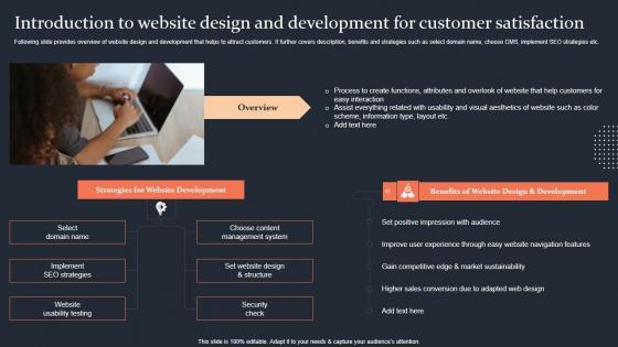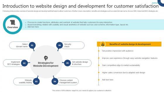 Following slide provides overview of website design and development that helps to attract customers. It further covers description, benefits and strategies such as select domain name, choose CMS, implement SEO strategies etc. This modern and well-arranged Complete Guide To Launch Introduction To Website Design And Development provides lots of creative possibilities. It is very simple to customize and edit with the Powerpoint Software. Just drag and drop your pictures into the shapes. All facets of this template can be edited with Powerpoint, no extra software is necessary. Add your own material, put your images in the places assigned for them, adjust the colors, and then you can show your slides to the world, with an animated slide included. Following slide provides overview of website design and development that helps to attract customers. It further covers description, benefits and strategies such as select domain name, choose CMS, implement SEO strategies etc.