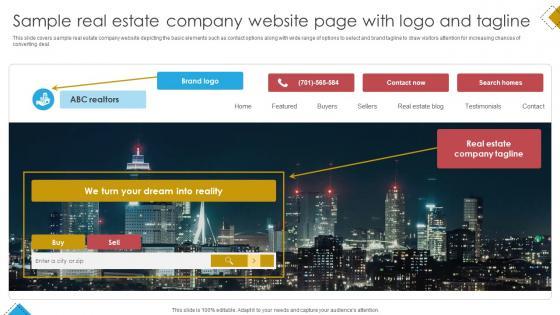 This slide covers sample real estate company website depicting the basic elements such as contact options along with wide range of options to select and brand tagline to draw visitors attention for increasing chances of converting deal. Whether you have daily or monthly meetings, a brilliant presentation is necessary. Blueprint For Effective Real Sample Real Estate Company Website Page With Logo Strategy SS V can be your best option for delivering a presentation. Represent everything in detail using Blueprint For Effective Real Sample Real Estate Company Website Page With Logo Strategy SS V and make yourself stand out in meetings. The template is versatile and follows a structure that will cater to your requirements. All the templates prepared by Slidegeeks are easy to download and edit. Our research experts have taken care of the corporate themes as well. So, give it a try and see the results. This slide covers sample real estate company website depicting the basic elements such as contact options along with wide range of options to select and brand tagline to draw visitors attention for increasing chances of converting deal.