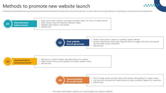 Following slide represents various ways to promote website launch that helps to increase visitors and click through rates. It include methods such as generate buzz, host giveaways, email list and social media graphics. Retrieve professionally designed Complete Guide To Launch Methods To Promote New Website Launch to effectively convey your message and captivate your listeners. Save time by selecting pre-made slideshows that are appropriate for various topics, from business to educational purposes. These themes come in many different styles, from creative to corporate, and all of them are easily adjustable and can be edited quickly. Access them as PowerPoint templates or as Google Slides themes. You do not have to go on a hunt for the perfect presentation because Slidegeeks got you covered from everywhere. Following slide represents various ways to promote website launch that helps to increase visitors and click through rates. It include methods such as generate buzz, host giveaways, email list and social media graphics.