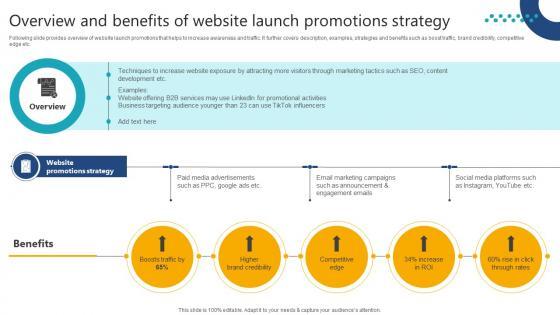 Following slide provides overview of website launch promotions that helps to increase awareness and traffic. It further covers description, examples, strategies and benefits such as boost traffic, brand credibility, competitive edge etc. Presenting this PowerPoint presentation, titled Complete Guide To Launch Overview And Benefits Of Website Launch Promotions, with topics curated by our researchers after extensive research. This editable presentation is available for immediate download and provides attractive features when used. Download now and captivate your audience. Presenting this Complete Guide To Launch Overview And Benefits Of Website Launch Promotions. Our researchers have carefully researched and created these slides with all aspects taken into consideration. This is a completely customizable Complete Guide To Launch Overview And Benefits Of Website Launch Promotions that is available for immediate downloading. Download now and make an impact on your audience. Highlight the attractive features available with our PPTs. Following slide provides overview of website launch promotions that helps to increase awareness and traffic. It further covers description, examples, strategies and benefits such as boost traffic, brand credibility, competitive edge etc.