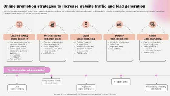 This slide presents key strategies to help salon business promote its brand online and increase traffic, conversion and sales. It includes tactics such as create a strong online presence, offer discounts and promotions, utilize email marketing, partner with influencers and utilize video marketing. From laying roadmaps to briefing everything in detail, our templates are perfect for you. You can set the stage with your presentation slides. All you have to do is download these easy-to-edit and customizable templates. Customizing The Salon Experience Online Promotion Strategies To Increase Website Traffic Strategy SS V will help you deliver an outstanding performance that everyone would remember and praise you for. Do download this presentation today. This slide presents key strategies to help salon business promote its brand online and increase traffic, conversion and sales. It includes tactics such as create a strong online presence, offer discounts and promotions, utilize email marketing, partner with influencers and utilize video marketing.