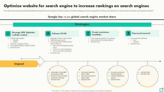 This slide showcases the website optimization techniques for search engine to enhance ranking. It includes strategies such as on-page SEO, enhance user experience, create maximum backlinks and keywords research. This Optimize Website For Search Engine To Accelerating Market Share And Profitability MKT SS V from Slidegeeks makes it easy to present information on your topic with precision. It provides customization options, so you can make changes to the colors, design, graphics, or any other component to create a unique layout. It is also available for immediate download, so you can begin using it right away. Slidegeeks has done good research to ensure that you have everything you need to make your presentation stand out. Make a name out there for a brilliant performance. This slide showcases the website optimization techniques for search engine to enhance ranking. It includes strategies such as on-page SEO, enhance user experience, create maximum backlinks and keywords research.
