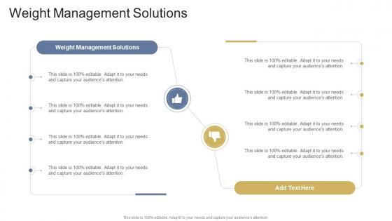 Presenting our innovatively designed set of slides titled Weight Management Solutions In Powerpoint And Google Slides Cpb This completely editable PowerPoint graphic exhibits Weight Management Solutions that will help you convey the message impactfully. It can be accessed with Google Slides and is available in both standard screen and widescreen aspect ratios. Apart from this, you can download this well structured PowerPoint template design in different formats like PDF, JPG, and PNG. So, click the download button now to gain full access to this PPT design. Our Weight Management Solutions In Powerpoint And Google Slides Cpb are topically designed to provide an attractive backdrop to any subject. Use them to look like a presentation pro.