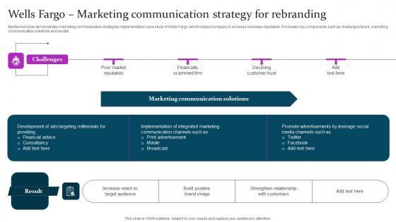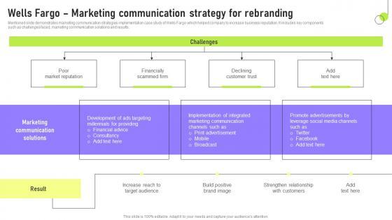 Mentioned slide demonstrates marketing communication strategies implementation case study of Wells Fargo which helped company to increase business reputation. It includes key components such as challenges faced, marketing communication solutions and results. Slidegeeks has constructed Wells Fargo Marketing Communication Strategy For Rebranding Guidelines PDF after conducting extensive research and examination. These presentation templates are constantly being generated and modified based on user preferences and critiques from editors. Here, you will find the most attractive templates for a range of purposes while taking into account ratings and remarks from users regarding the content. This is an excellent jumping off point to explore our content and will give new users an insight into our top notch PowerPoint Templates.
