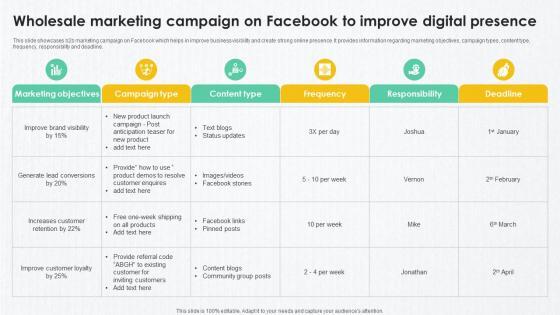 This slide showcases b2b marketing campaign on Facebook which helps in improve business visibility and create strong online presence. It provides information regarding marketing objectives, campaign types, content type, frequency, responsibility and deadline. Take your projects to the next level with our ultimate collection of Wholesale Marketing Campaign On Facebook To Improve Digital Ppt Presentation. Slidegeeks has designed a range of layouts that are perfect for representing task or activity duration, keeping track of all your deadlines at a glance. Tailor these designs to your exact needs and give them a truly corporate look with your own brand colors they will make your projects stand out from the rest This slide showcases b2b marketing campaign on Facebook which helps in improve business visibility and create strong online presence. It provides information regarding marketing objectives, campaign types, content type, frequency, responsibility and deadline.