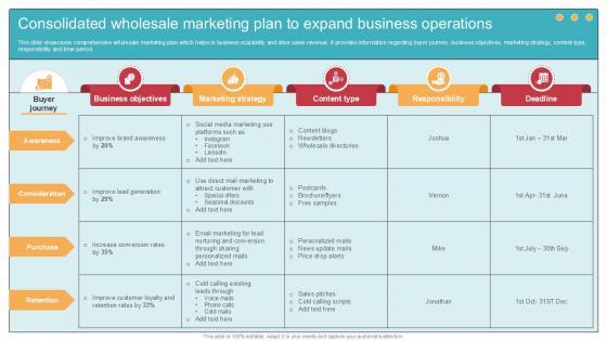 This slide showcases comprehensive wholesale marketing plan which helps in business scalability and drive sales revenue. It provides information regarding buyer journey, business objectives, marketing strategy, content type, responsibility and time period. Are you in need of a template that can accommodate all of your creative concepts This one is crafted professionally and can be altered to fit any style. Use it with Google Slides or PowerPoint. Include striking photographs, symbols, depictions, and other visuals. Fill, move around, or remove text boxes as desired. Test out color palettes and font mixtures. Edit and save your work, or work with colleagues. Download Consolidated Wholesale Marketing Plan Comprehensive Guide To Wholesale Ppt Powerpoint and observe how to make your presentation outstanding. Give an impeccable presentation to your group and make your presentation unforgettable. This slide showcases comprehensive wholesale marketing plan which helps in business scalability and drive sales revenue. It provides information regarding buyer journey, business objectives, marketing strategy, content type, responsibility and time period.
