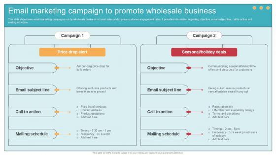 This slide showcases email marketing campaigns run by wholesale business to boost sales and improve customer engagement rates. It provides information regarding objective, email subject line, call to action and mailing schedule. Take your projects to the next level with our ultimate collection of B2B Marketing Techniques To Email Marketing Campaign To Promote Wholesale. Slidegeeks has designed a range of layouts that are perfect for representing task or activity duration, keeping track of all your deadlines at a glance. Tailor these designs to your exact needs and give them a truly corporate look with your own brand colors they will make your projects stand out from the rest This slide showcases email marketing campaigns run by wholesale business to boost sales and improve customer engagement rates. It provides information regarding objective, email subject line, call to action and mailing schedule.