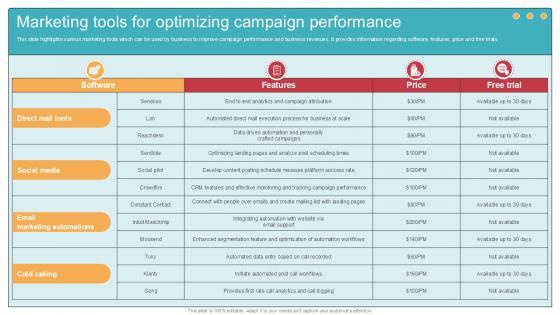 This slide highlights various marketing tools which can be used by business to improve campaign performance and business revenues. It provides information regarding software, features, price and free trials. This modern and well-arranged Marketing Tools For Optimizing Comprehensive Guide To Wholesale Ppt Powerpoint provides lots of creative possibilities. It is very simple to customize and edit with the Powerpoint Software. Just drag and drop your pictures into the shapes. All facets of this template can be edited with Powerpoint, no extra software is necessary. Add your own material, put your images in the places assigned for them, adjust the colors, and then you can show your slides to the world, with an animated slide included. This slide highlights various marketing tools which can be used by business to improve campaign performance and business revenues. It provides information regarding software, features, price and free trials.