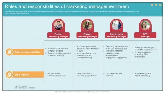 This slide represents major roles for marketing management team which helps improve business efficiency and revenues. It includes product marketing manager, content marketing manager, social media manager, and SEO manager. The Roles And Responsibilities Of Marketing Comprehensive Guide To Wholesale Ppt Powerpoint is a compilation of the most recent design trends as a series of slides. It is suitable for any subject or industry presentation, containing attractive visuals and photo spots for businesses to clearly express their messages. This template contains a variety of slides for the user to input data, such as structures to contrast two elements, bullet points, and slides for written information. Slidegeeks is prepared to create an impression. This slide represents major roles for marketing management team which helps improve business efficiency and revenues. It includes product marketing manager, content marketing manager, social media manager, and SEO manager.