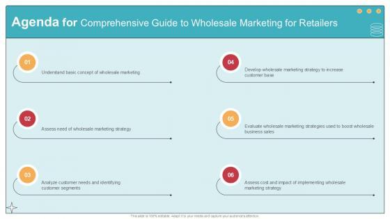 Find a pre-designed and impeccable Agenda For Comprehensive Guide To Wholesale Marketing For Retailers Ppt Presentation. The templates can ace your presentation without additional effort. You can download these easy-to-edit presentation templates to make your presentation stand out from others. So, what are you waiting for Download the template from Slidegeeks today and give a unique touch to your presentation. Our Agenda For Comprehensive Guide To Wholesale Marketing For Retailers Ppt Presentation are topically designed to provide an attractive backdrop to any subject. Use them to look like a presentation pro.