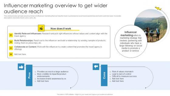 This slide provides glimpse about summary of influencer marketing that can help the travel businesses to boost brand awareness and build customer base. It includes description, how does it work, pros, cons, etc. Coming up with a presentation necessitates that the majority of the effort goes into the content and the message you intend to convey. The visuals of a PowerPoint presentation can only be effective if it supplements and supports the story that is being told. Keeping this in mind our experts created Tour And Travel Agency Marketing Influencer Marketing Overview To Get Wider Audience Slides PDF to reduce the time that goes into designing the presentation. This way, you can concentrate on the message while our designers take care of providing you with the right template for the situation.