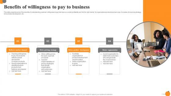 This slide presents some of the benefits of understanding customer willingness to pay that improve overall profitability and find the right market for organizational products and services. It includes drive pricing strategy, drive product development, etc. Pitch your topic with ease and precision using this Benefits Of Willingness To Pay To Business Ppt Professional Smartart Pdf. This layout presents information on Reflects Market Demand, Drive Pricing Strategy, Drives Product Development. It is also available for immediate download and adjustment. So, changes can be made in the color, design, graphics or any other component to create a unique layout. This slide presents some of the benefits of understanding customer willingness to pay that improve overall profitability and find the right market for organizational products and services. It includes drive pricing strategy, drive product development, etc.