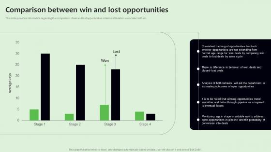 This slide provides information regarding the comparison of win and lost opportunities in terms of duration associated to them. This Comparison Between Win And Lost Opportunities Managing Sales Pipeline Health Formats PDF from Slidegeeks makes it easy to present information on your topic with precision. It provides customization options, so you can make changes to the colors, design, graphics, or any other component to create a unique layout. It is also available for immediate download, so you can begin using it right away. Slidegeeks has done good research to ensure that you have everything you need to make your presentation stand out. Make a name out there for a brilliant performance.