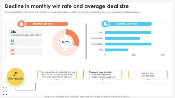 This slide highlights the monthly win rate by the number of deals closed opportunities along with the win rate by an amount that helps the business to analyze its current business strategy. Are you in need of a template that can accommodate all of your creative concepts This one is crafted professionally and can be altered to fit any style. Use it with Google Slides or PowerPoint. Include striking photographs, symbols, depictions, and other visuals. Fill, move around, or remove text boxes as desired. Test out color palettes and font mixtures. Edit and save your work, or work with colleagues. Download Business Development Team Decline In Monthly Win Rate And Average Deal Size SA SS V and observe how to make your presentation outstanding. Give an impeccable presentation to your group and make your presentation unforgettable. This slide highlights the monthly win rate by the number of deals closed opportunities along with the win rate by an amount that helps the business to analyze its current business strategy.