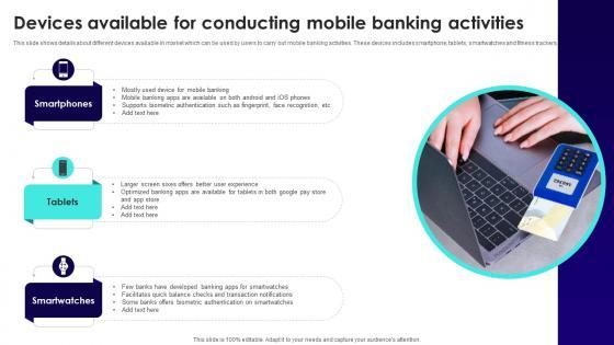 This slide shows details about different devices available in market which can be used by users to carry out mobile banking activities. These devices includes smartphone, tablets, smartwatches and fitness trackers. Make sure to capture your audiences attention in your business displays with our gratis customizable Wireless Banking To Improve Devices Available For Conducting Mobile Banking Fin SS V. These are great for business strategies, office conferences, capital raising or task suggestions. If you desire to acquire more customers for your tech business and ensure they stay satisfied, create your own sales presentation with these plain slides. This slide shows details about different devices available in market which can be used by users to carry out mobile banking activities. These devices includes smartphone, tablets, smartwatches and fitness trackers.
