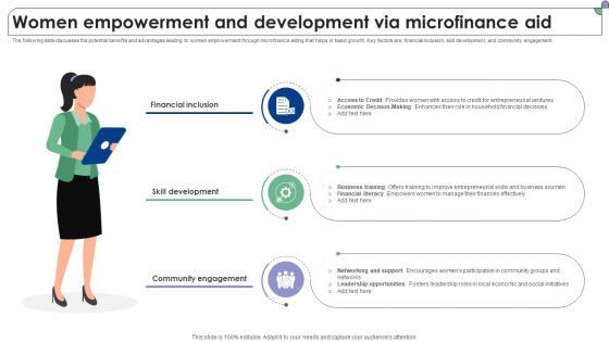 The following slide discusses the potential benefits and advantages leading to women empowerment through microfinance aiding that helps in basic growth. Key factors are financial inclusion, skill development, and community engagement. This modern and well-arranged Women Empowerment And Development Via Microfinance Aid Complete Guide To Microfinance Fin SS V provides lots of creative possibilities. It is very simple to customize and edit with the Powerpoint Software. Just drag and drop your pictures into the shapes. All facets of this template can be edited with Powerpoint, no extra software is necessary. Add your own material, put your images in the places assigned for them, adjust the colors, and then you can show your slides to the world, with an animated slide included. The following slide discusses the potential benefits and advantages leading to women empowerment through microfinance aiding that helps in basic growth. Key factors are financial inclusion, skill development, and community engagement.