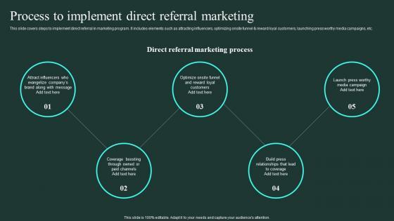 This slide covers steps to implement direct referral in marketing program. It includes elements such as attracting influencers, optimizing onsite funnel And reward loyal customers, launching press worthy media campaigns, etc.The best PPT templates are a great way to save time, energy, and resources. Slidegeeks have 100Precent editable powerpoint slides making them incredibly versatile. With these quality presentation templates, you can create a captivating and memorable presentation by combining visually appealing slides and effectively communicating your message. Download Process To Implement Direct Referral Marketing Word Of Mouth Marketing Inspiration Pdf from Slidegeeks and deliver a wonderful presentation. This slide covers steps to implement direct referral in marketing program. It includes elements such as attracting influencers, optimizing onsite funnel and reward loyal customers, launching press worthy media campaigns, etc.