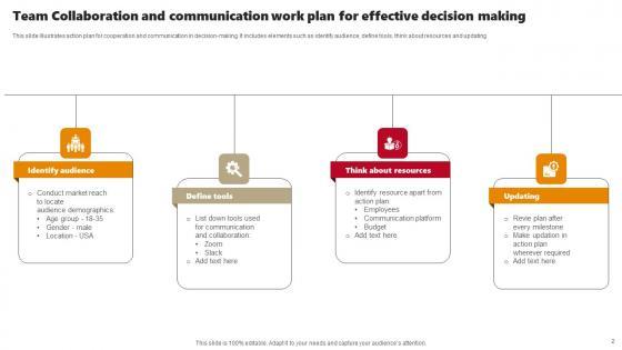 This slide illustrates action plan for cooperation and communication in decision making. It includes elements such as identify audience, define tools, think about resources and updating Showcasing this set of slides titled Team Collaboration And Communication Work Plan For Effective Decision Making Slides Pdf. The topics addressed in these templates are Identify Audience, Define Tools, About Resources. All the content presented in this PPT design is completely editable. Download it and make adjustments in color, background, font etc. as per your unique business setting. This slide illustrates action plan for cooperation and communication in decision-making. It includes elements such as identify audience, define tools, think about resources and updating