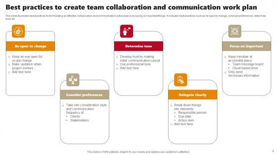 This slide illustrates best practices for formulating an effective collaboration and communication action plan by focusing on important things. It includes best practices such as be open to change, consider preferences, determine tone etc. Showcasing this set of slides titled Best Practices To Create Team Collaboration And Communication Work Plan Clipart Pdf. The topics addressed in these templates are Determine Tone, Consider Preferences, Delegate Clearly. All the content presented in this PPT design is completely editable. Download it and make adjustments in color, background, font etc. as per your unique business setting. This slide illustrates best practices for formulating an effective collaboration and communication action plan by focusing on important things. It includes best practices such as be open to change, consider preferences, determine tone etc.