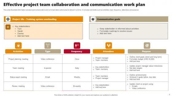This slide illustrate information about project collaboration and communication action plan to deliver it on time. It includes elements such as activities, type, frequency, attendees and purpose Pitch your topic with ease and precision using this Effective Project Team Collaboration And Communication Work Plan Icons Pdf. This layout presents information on Activities, Frequency, Attendees . It is also available for immediate download and adjustment. So, changes can be made in the color, design, graphics or any other component to create a unique layout. This slide illustrate information about project collaboration and communication action plan to deliver it on time. It includes elements such as activities, type, frequency, attendees and purpose