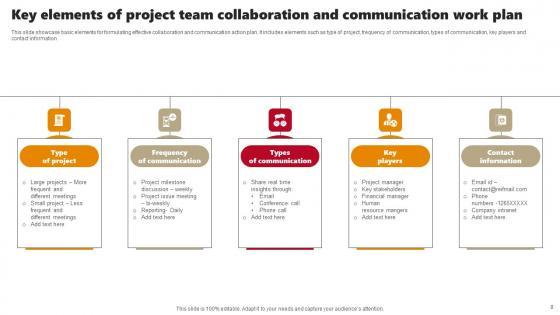 This slide showcase basic elements for formulating effective collaboration and communication action plan. It includes elements such as type of project, frequency of communication, types of communication, key players and contact information Pitch your topic with ease and precision using this Key Elements Of Project Team Collaboration And Communication Work Plan Elements Pdf. This layout presents information on Communication, Key Players, Contact Information. It is also available for immediate download and adjustment. So, changes can be made in the color, design, graphics or any other component to create a unique layout. This slide showcase basic elements for formulating effective collaboration and communication action plan. It includes elements such as type of project, frequency of communication, types of communication, key players and contact information
